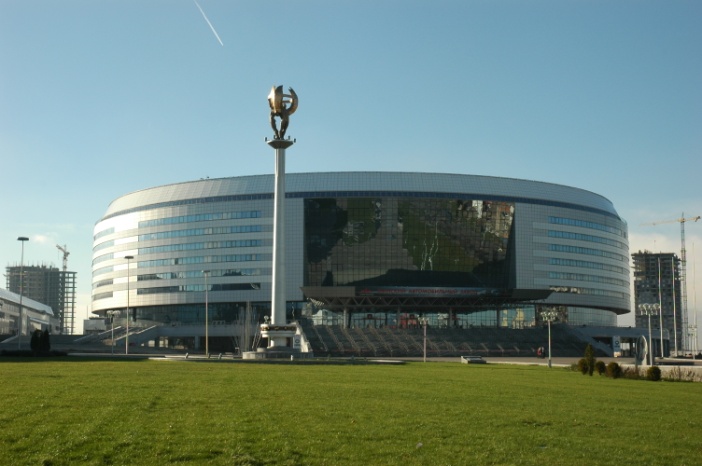 Минск-арена построена в 2006-2009 гг. В основе художественного образа лежит стилизованная форма шайбы, которая символизирует зимние виды спорта.
