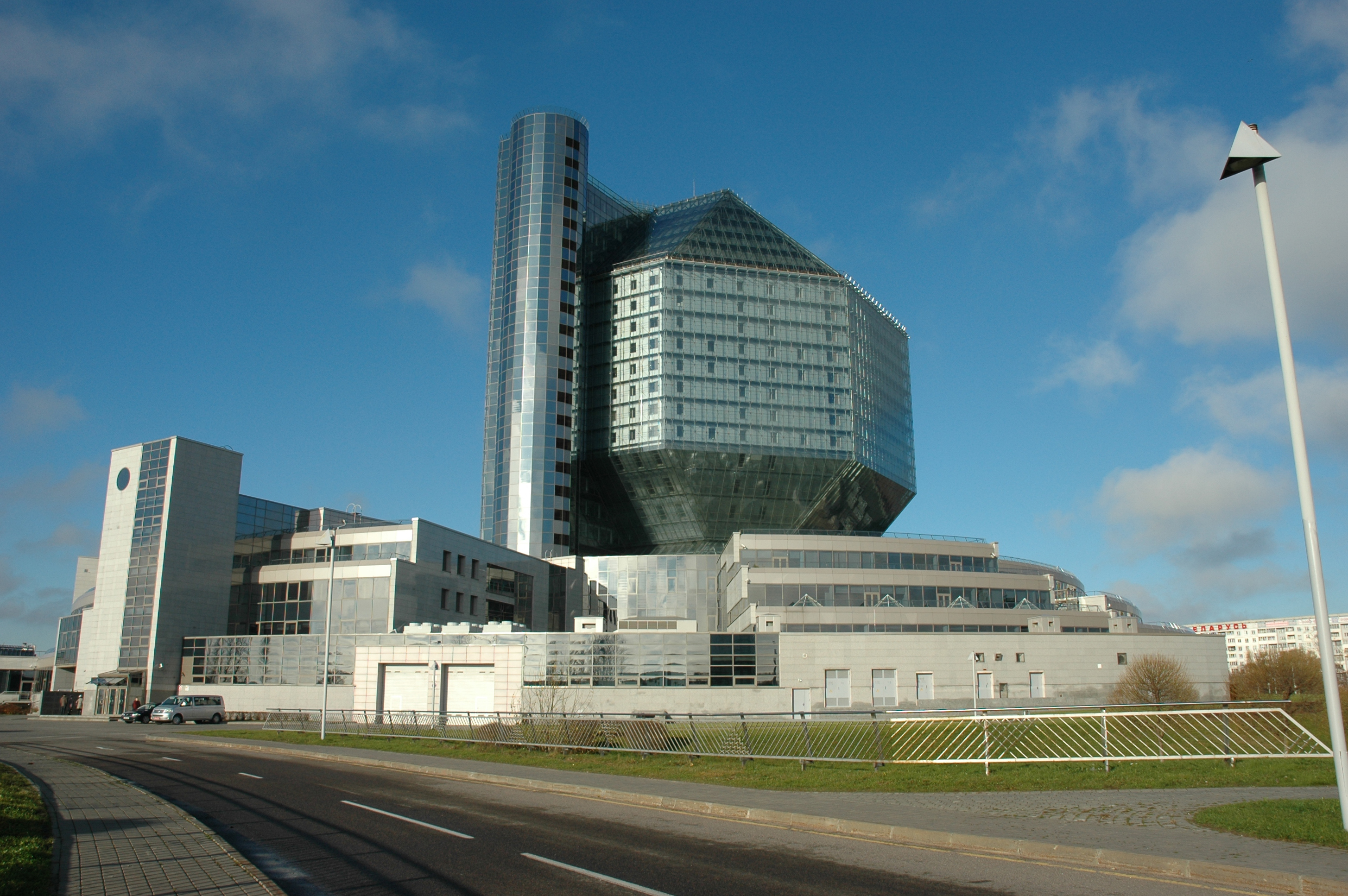 Национальная библиотека Беларуси — главная универсальная научная библиотека Беларуси. Здание представляет собой ромбокубоктаэдр высотой 73,6 м (23 этажа). Самое знаменитое здание библиотеки было разработано архитекторами М. К. Виноградовым и В. В. Крамаренко ещё в конце 1980-х годов, однако новое здание Национальной библиотеки было открыто только 16 июня 2006 года.